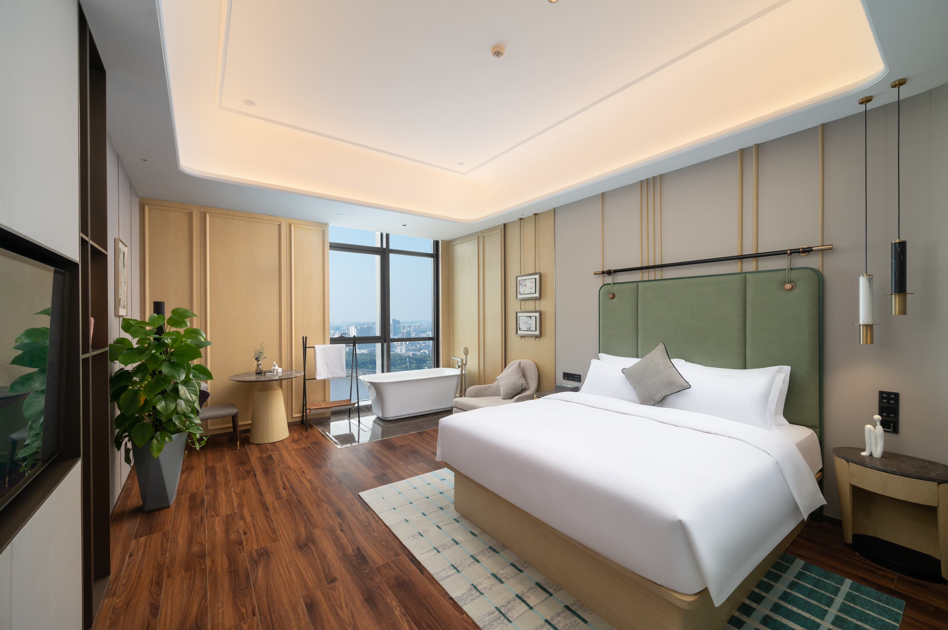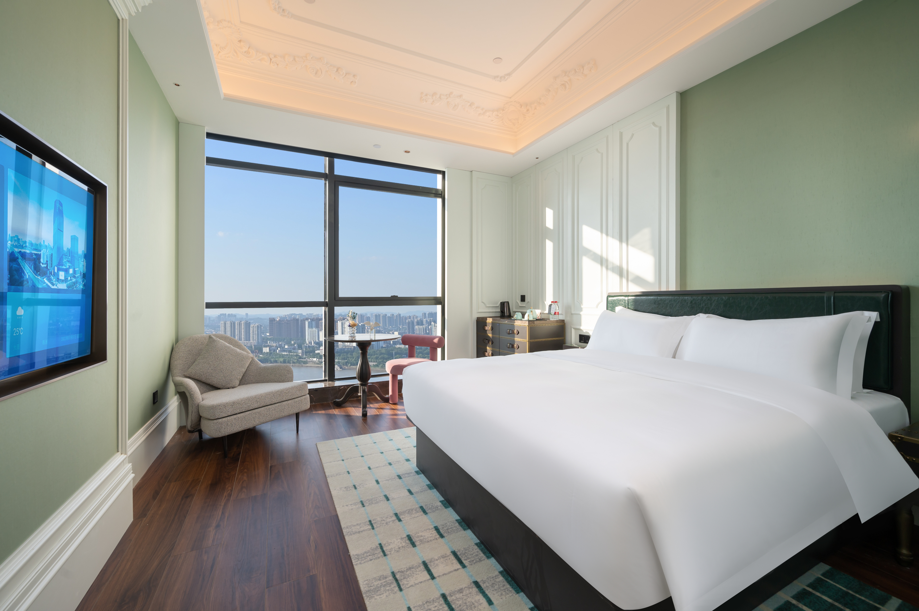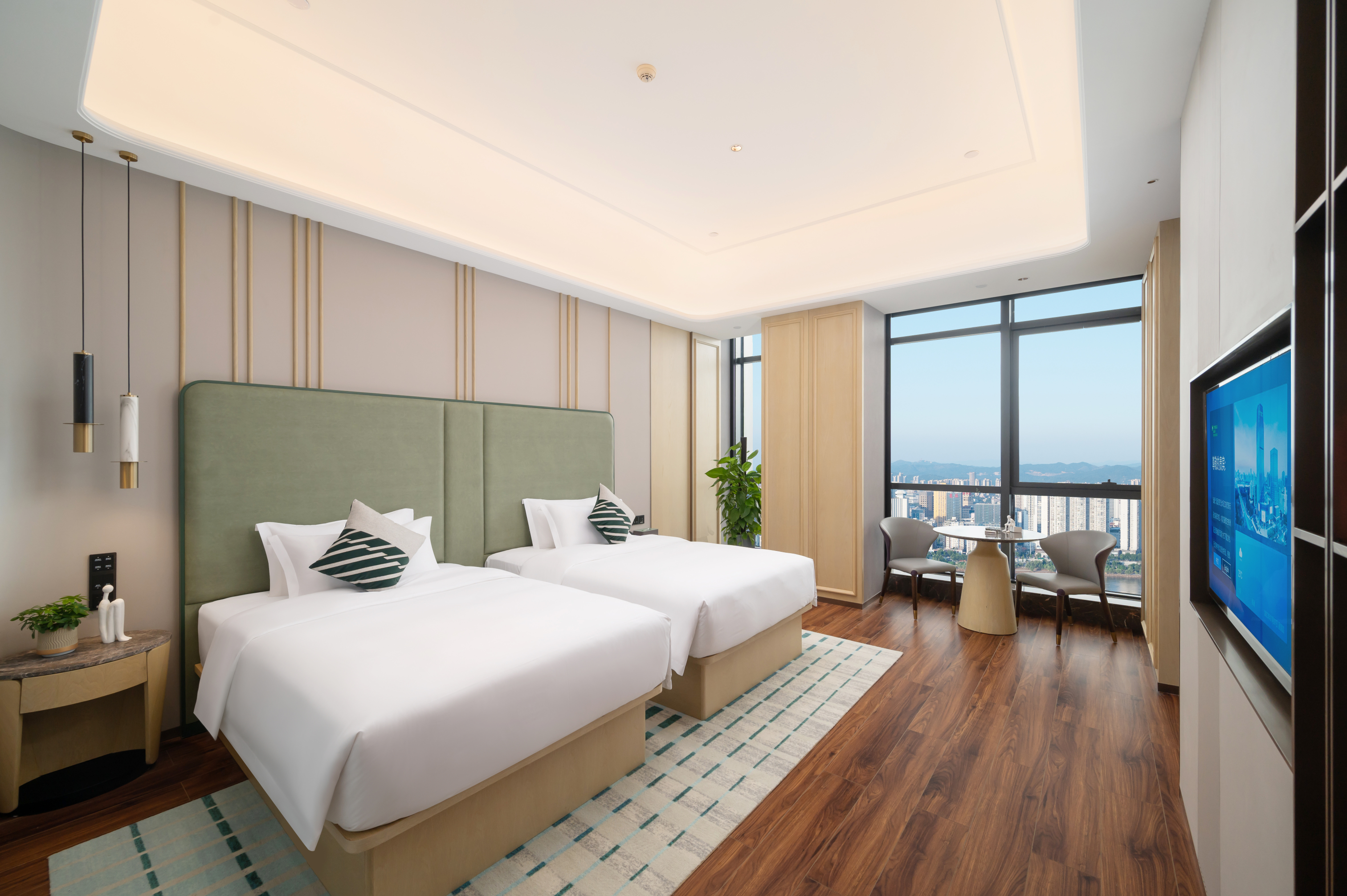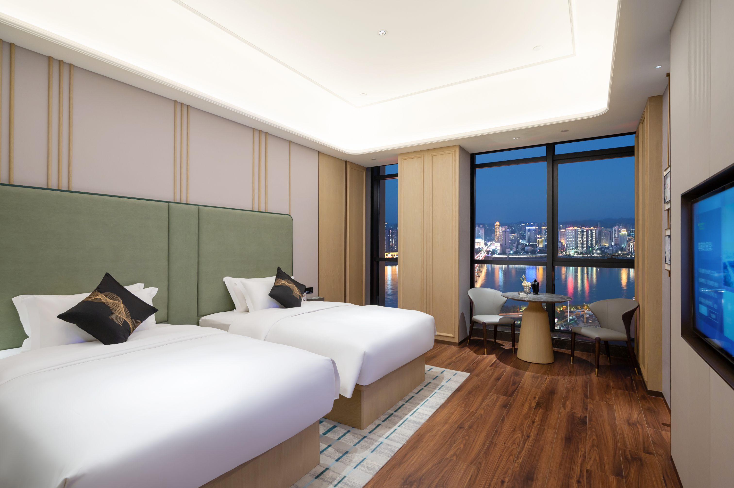 酒店拥有三面全线高层揽江景观,东依株洲市城市名片——神农城。充满艺术、人文设计的空中客房以及套房,灵活特异的空间格局、落地窗和自然采光把客房打造成时尚舒适的休憩。